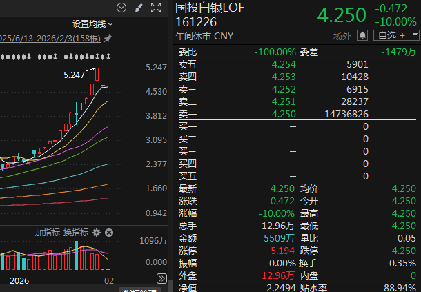 2月3日,国投白银LOF复牌后再度一字跌停。在连续的跌停板下,当日早盘其成交额不足1亿元,与前几个交易日动辄数十亿元的日成交额相比,流动性大幅下降,许多资金一时间根本“跑不掉”。