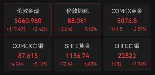 2月4日早盘,现货黄金开盘直线拉升,重新站上5000美元/盎司。截至10时20分,现货黄金涨至5060.960美元/盎司,日内涨超2.42%;现货白银涨3.10%,报88.061美元/盎司。