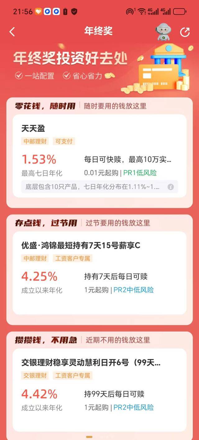 邮储银行App亦开设年终奖理财专栏,主推3款低风险或中低风险产品,期限设计兼具灵活性——涵盖每日可赎、持有7天后每日可赎、持有99天后每日可赎三种类型。邮储银行明确,流动性需求高的客户可选择每日快赎产品;追求稳健增值且短期不用钱的客户,适配持有7天后每日可赎产品;中长期闲置资金则可考虑持有99天后每日可赎产品,通过适度锁定期限换取更高收益。其中,持有7天后每日可赎产品和持有99天后每日可赎产品成立以来的年化收益率都超过了4%。
