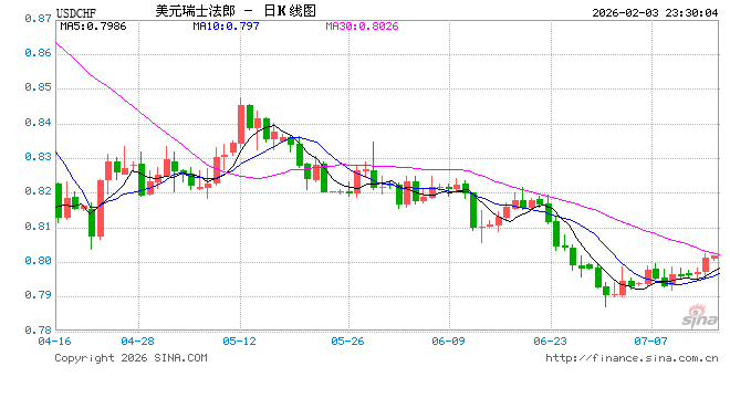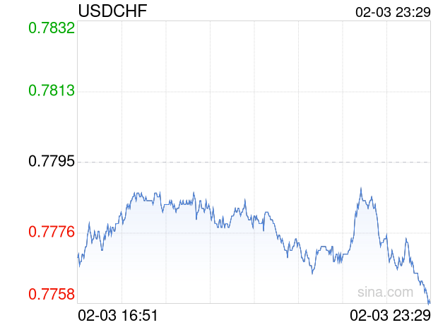 新浪外汇消息2026年02月03日,截至23时29分,外汇市场上美元兑瑞士法郎汇率跌破1美元兑换0.7756瑞士法郎。跌幅为-0.5003%