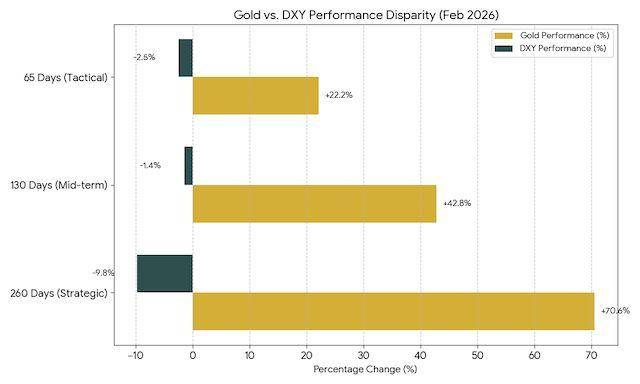 根据BCA Research的计算方法,在一个完整的年度交易周期内,美元指数从107.96回落至97.42,跌幅仅为9.76%;而同期金价却从每盎司2875美元飙升至2月3日的4905美元,涨幅超过70%。若以半年为观察窗口,这一背离更为显著,美元指数微跌1.38%,金价却暴涨42.84%,两者变动倍数比达到31倍。