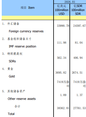 国家外汇管理局统计数据显示,截至2026年1月末,我国外汇储备规模为33991亿美元,较2025年12月末上升412亿美元,升幅为1.23%。