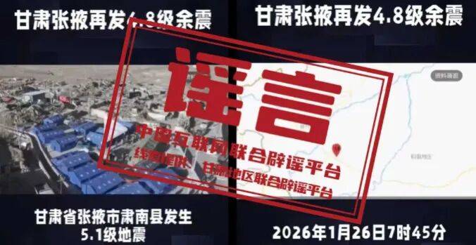 详情:近期,网上流传“2026年1月26日7时45分甘肃省张掖市肃南县发生5.1级地震”“甘肃张掖再发4.8级余震”等消息,引发关注。经核实,网传视频中所显示震中地理位置位于新疆喀什、和田地区,所呈现的季节特征也与甘肃省张掖市本季节景色不符。截至当前,中国地震台网中心未查询到张掖市辖区当日发生地震的相关记录,张掖市地震局、张掖地震监测中心站未监测到任何可能引发破坏性地震的前兆异常信号,也未发布任何地震预警、预报信息。网传内容不实。(来源:“甘肃网络举报”微信公众号、张掖市融媒体中心、张掖市地震局)