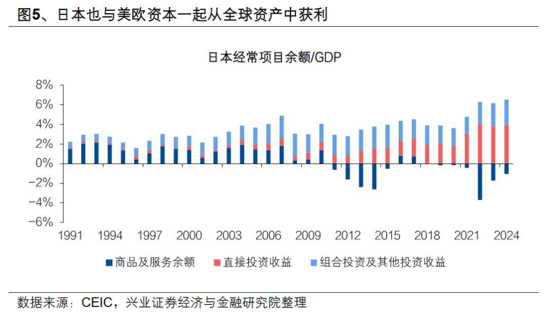 第二阶段:单极秩序时期(苏联解体后)——日本的地缘价值体现于金融领域。随着单极秩序的形成,日本作为工业与军事补给基地的重要性相对下降。与此同时,日本在战后依托美国发展起来的经济体系,在失去与美国直接竞争的能力后,其安全性反而得到提升。此外,美国通过金融资本从全球获利的意愿增强、阻力减小。日本在完成一定的资本积累后,成为资本富裕国,其长期低利率环境为美国资本提供了稳定的杠杆工具。作为回报,日本资本亦与美欧资本共同分享了全球尤其是新兴市场的发展红利。