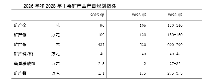 规划提到,到2028年,紫金矿业的资源储量、主要矿产品产量、销售收入、资产规模、利润等综合指标排名进一步提升,铜、金矿产品产量进入全球前3位。预计2026年矿产金达到105吨,全面建成高度适配且具有紫金特色的全球化运营管理体系和ESG可持续发展体系;力争到2035年,公司主要指标较2025年实现跨越式增长,部分指标达到全球首位,全面建成“绿色高技术超一流国际矿业集团”。