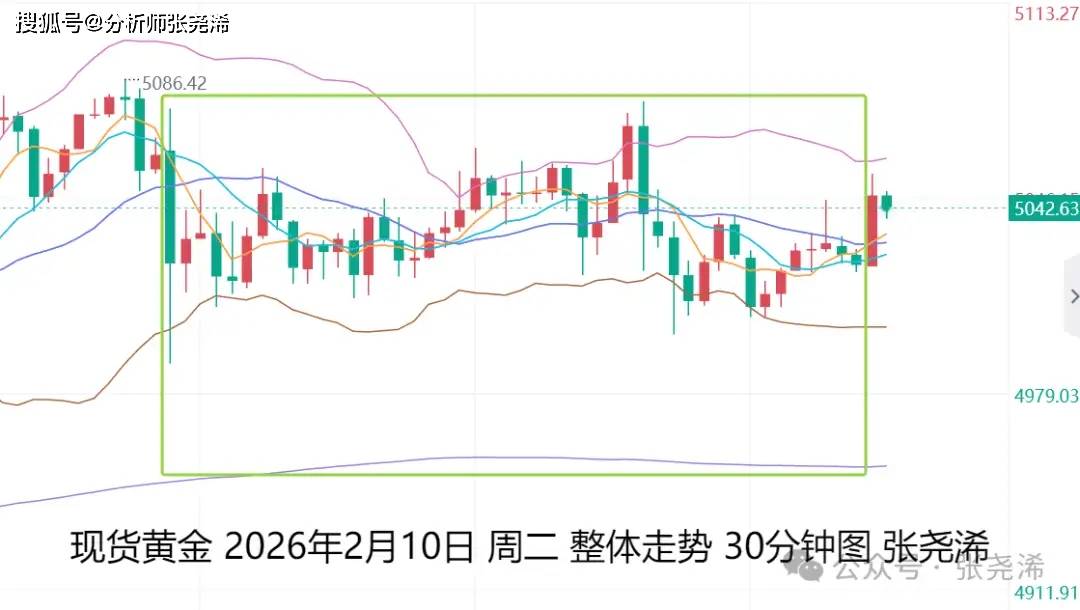 上交易日周二(2月10日):国际黄金震荡收跌,虽然美国12月零售销售意外停滞,推动金价一度拉升,但美联储官员却淡化降息紧迫性,白宫高官驳斥就业转差论,随后迅速回吐涨幅,未能进一步走强,多头动力缓解,但也仍运行在布林带中轨上方,暗示后市仍有再度走强攀升的预期。