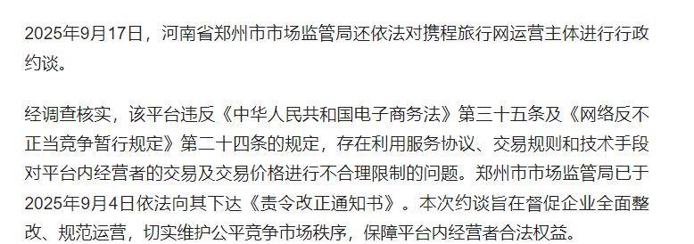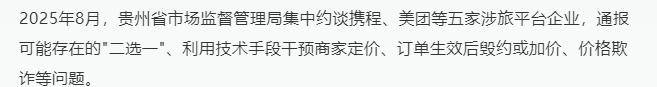 而且这不是携程第一次被监管约谈了。2025年8月,贵州市监局就把携程、美团等五家涉旅平台叫去谈话,直指“二选一”、技术干预定价这些问题。