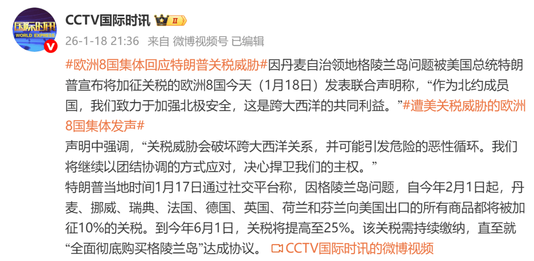 据CCTV国际时讯:因丹麦自治领地格陵兰岛问题被美国总统特朗普宣布将加征关税的欧洲8国今天(1月18日)发表联合声明称,“作为北约成员国,我们致力于加强北极安全,这是跨大西洋的共同利益。”