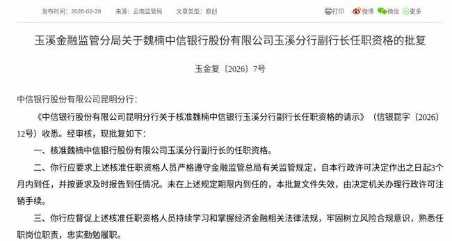 2026年2月28日,根据国家金融监督管理总局消息,《中信银行股份有限公司昆明分行关于核准魏楠中信银行玉溪分行副行长任职资格的请示》获得通过,批复魏楠中信银行股份有限公司玉溪分行副行长的任职资格。