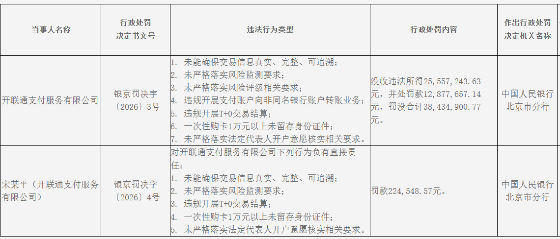 1月21日,中国人民银行北京市分行发布的行政处罚决定信息显示,开联通支付服务有限公司(以下简称“开联通支付”)存在未能确保交易信息真实、完整、可追溯;未严格落实风险监测要求;未严格落实风险评级相关要求;违规开展支付账户向非同名银行账户转账业务;违规开展“T+0”交易结算;一次性购卡1万元以上未留存身份证件;未严格落实法定代表人开户意愿核实相关要求等违法行为,被没收违法所得2555.72万元,并被处罚款1287.77万元,罚没合计3843.49万元。相关责任人宋某平被罚款22.45万元。