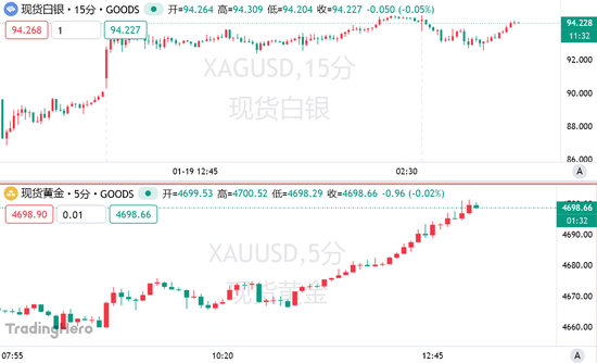 周二午间,现货黄金突破前高,历史首次站上4700美元/盎司,新年首月涨幅达8.8%,涨逾380美元。纽约期金在此之前也已站上4700美元/盎司,创下历史新高。与此同时,现货白银早些时候触及每盎司94.7295美元的历史高点,然后回落。
