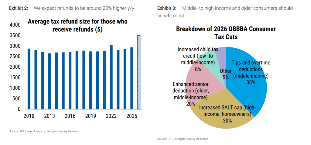 - 关键数据: 摩根士丹利预计,今年的个人退税额将比去年高出400亿至700亿美元。如果收到退税的消费者数量保持不变,平均退税规模将增加550美元,达到约3500美元的历史高位。