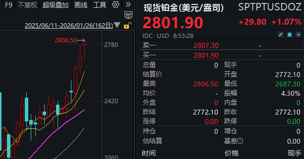 【大河财立方消息】1月26日,现货铂金首次站上2800美元/盎司,最高一度达2806.50美元/盎司。