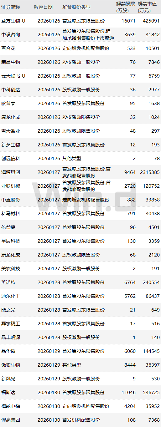 Wind数据统计显示,本周(1月26日-1月30日)共有29家公司限售股陆续解禁,合计解禁7.72亿股,按1月23日收盘价计算,解禁总市值为408.87亿元。