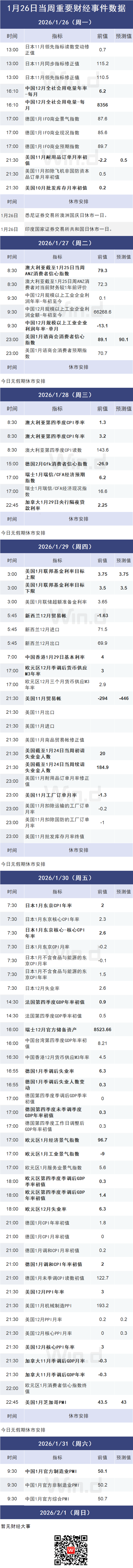 财报方面,约五分之一的标普500成分股将在本周公布季度业绩,其中包括苹果、微软、Meta和特斯拉这四家“美股七巨头”成员。本轮财报季的一个关键主题在于:企业是否开始真正从AI相关投资中获益。在2025年末,市场曾担心大规模投向数据中心及其他基础设施的资本支出能否带来回报,这种疑虑一度打压科技股及其他AI概念股。