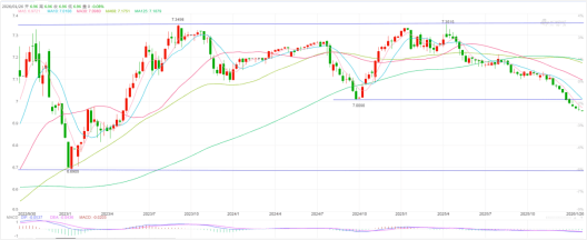 欧元兑人民币上周呈现探底回升走势,上周五汇价最低跌至8.0621之后强势回升,本周一亚洲市场最高涨至8.2840。日线观察,下方趋势线对于汇价的支撑起到了关键作用,上周五在短暂跌破该支撑后,欧元兑人民币呈现强势反弹,并一举突破多条均线压制,短线强势特征明显。周内如果汇价进一步延续反弹,则有望挑战上方趋势线压制(8.3150),该位置如果被有效突破,则汇价有望进一步反弹至2025年7-9月的高位8.40附近。
