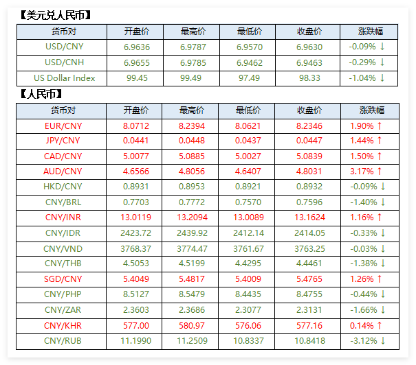 中间价方面,周一美元/人民币中间价报6.9843,下调(人民币升值)86点,近期中间价继续呈现下调的走势,日内中间价升值至2023年5月17日以来最高。而美元兑人民币汇价周一亚洲市场最低跌至6.9532,人民币继续保持升值的特征,综合来看,在美元走弱的情况下,加之国内相关部门的积极引导,预计人民币汇率有望继续保持温和的升值走势。