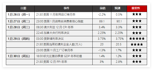 此前特朗普准备对德、法等欧洲多国威胁加征关税10%,但近期宣称加征关税取消,而上周末特朗普政府再度发出关税威胁称,如果加拿大与有关国家“达成协议”,将对进入美国的加拿大商品征收100%的关税。目前市场认为特朗普政府反复无常的政策再度出现,以及地缘风险或主导美元指数的下行。因此周内需对于特朗普最新的外交政策、地缘冲突继续关注。