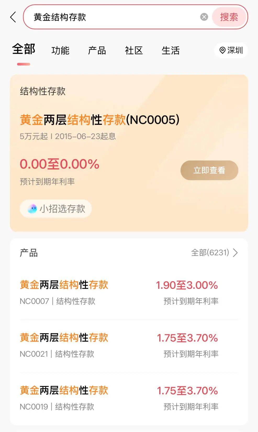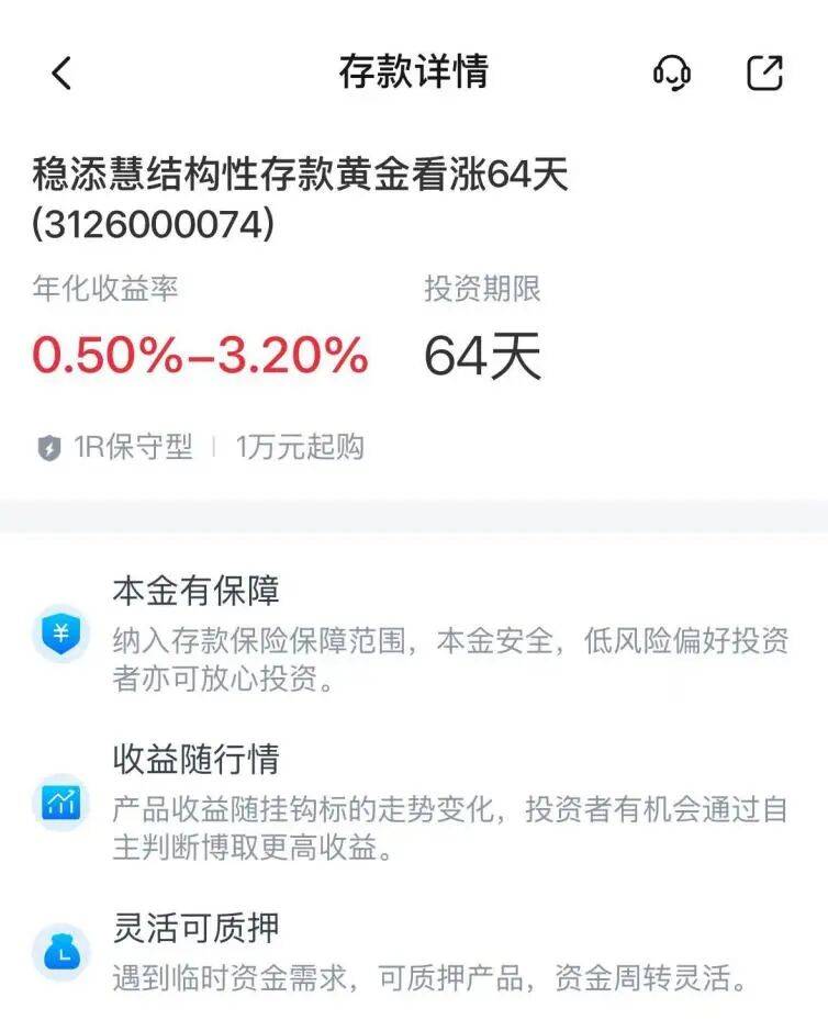 近期,多家银行App均推出了和黄金挂钩的结构性存款产品。例如,交通银行App显示了4款名为“稳添慧”的结构性存款产品,分别为黄金看涨64天、黄金看跌64天、股指看涨36天和股指看跌36天。这些产品均为R1低风险产品,1万元起购,预期年化收益区间为0.5%—3.20%。