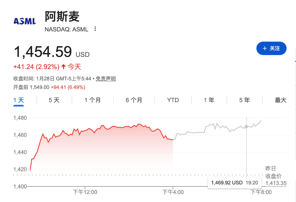 光刻机巨头阿斯麦(ASML)盘前一度大涨7.5%,创历史新高,其第四季度订单量远超预期,显示出AI基础设施建设正显著拉动先进芯片制造设备需求。美国设备股集体走强,应用材料涨4.1%,泛林集团涨4.4%,科磊涨3.1%。