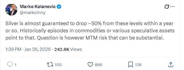 白银价格一路飙升,周四首次站上每盎司120美元。但摩根大通前首席策略师马尔科·科拉诺维奇预测,这种贵金属即将暴跌。他本周在X网站上发帖称:“白银几乎肯定会在一年左右的时间里从目前的水平下跌约50%。历史上大宗商品或各种投机性资产的走势都预示着这一点。”