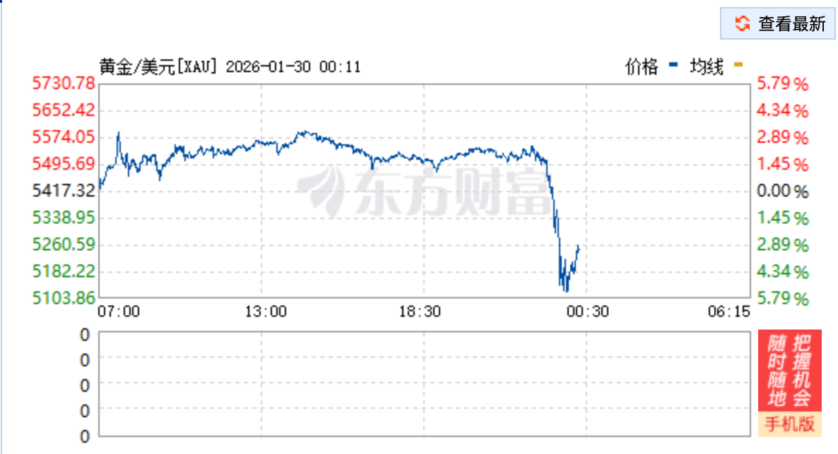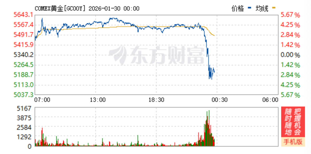 期货方面同样暴跌。COMEX黄金急跌,当天开盘价格5449.9美元/盎司,截至23点50分跌至5206美元/盎司,最低跌至5126.0美元/盎司,跌幅超过2%。