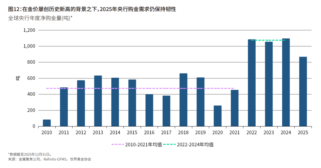 2025年,全年央行购金总量为863吨,与此前连续三年均超过1000吨的水平相比相对较低,但仍高于2010‒2021年间的年均水平,即473吨。