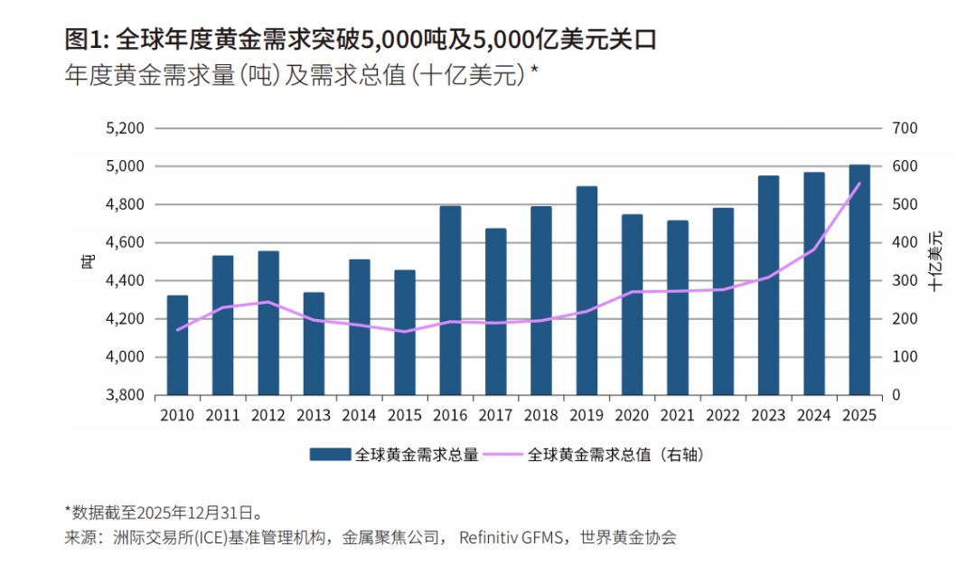 2025年,全球黄金总需求量(含场外交易)首次突破5000吨,达5002吨。叠加年内金价屡破纪录的强劲走势,全年共计53次创新高,全球黄金需求总值飙升至前所未有的5550亿美元,同比增长45%。