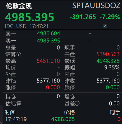 【大河财立方消息】1月30日,现货黄金跌7.37%,报4980.85美元/盎司;现货白银跌15.24%,报97.81美元/盎司。