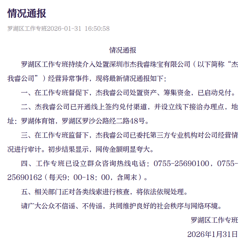 据深圳新闻网,1月31日,罗湖区工作专班发布情况通报称,罗湖区工作专班持续介入处置深圳市杰我睿珠宝有限公司(以下简称杰我睿公司)经营异常事件,现将最新情况通报如下: