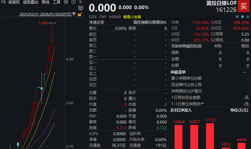 记者注意到,1月29日国投白银LOF连续第二天涨停,溢价率达64%。1月30日,国投白银LOF全天停牌。