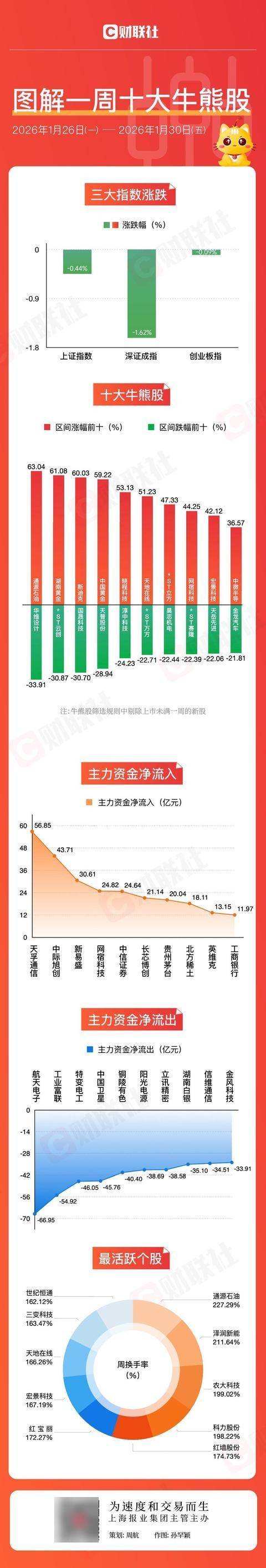 财联社2月1日讯,本周A股三大指数震荡回调,其中上证指数周跌0.44%,深成指周跌1.62%,创业板指周跌0.09%。本周贵金属、油气开采板块涨幅居前,黄金、小金属概念股表现活跃。