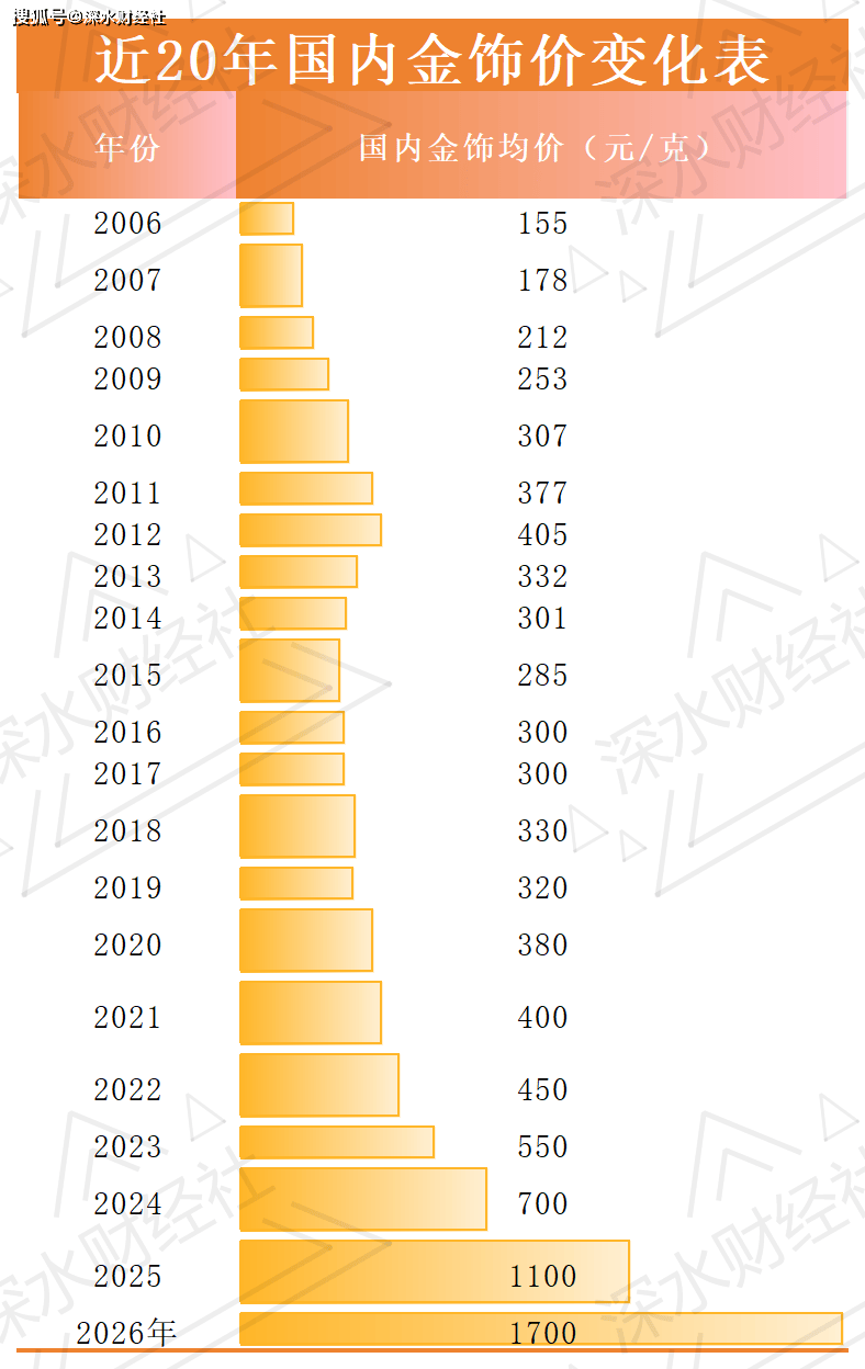 深水财经社整理了近20年来国内金饰的价格,在此特别说明下,价格因品牌、工艺、区域存在差异,此处取代表性区间。