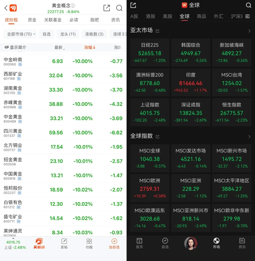 2日,A股市场黄金概念股大面积跌停,黄金白银的持续崩盘同样影响到全球股市。相关讨论区甚至有网友调侃:“本月元宝红包收益已经超过投资收益……”