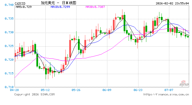 新浪外汇消息2026年02月02日,截至23时53分,外汇市场上加元兑美元汇率跌破1加元兑换0.7307美元。跌幅为-0.5261%