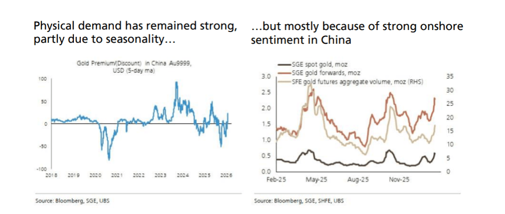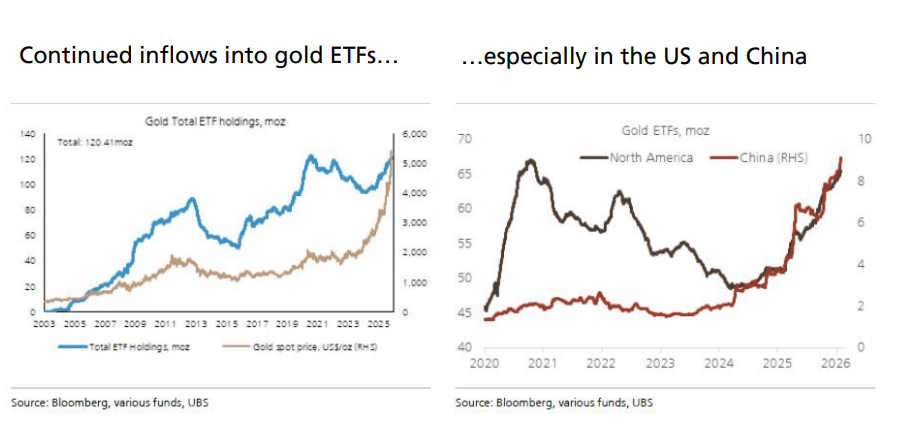 离岸避险情绪:瑞银分析称,中国在岸市场强烈的资产保值诉求,驱动资金疯狂涌入黄金ETF。瑞银的数据显示,中国已成为当前全球黄金ETF净流入的最强引擎,这种由“避险+资产轮动”驱动的买盘,比传统的礼品消费更具持续性和规模效应。