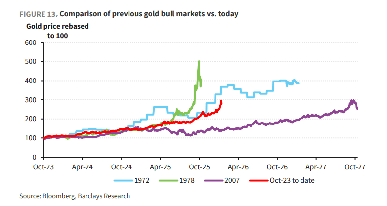 巴克莱的分析也印证了这一点。其模型显示,黄金的公允价值目前约在4000美元。尽管目前的溢价依然存在,但回落至4900美元后,溢价已回归至合理标准差内。