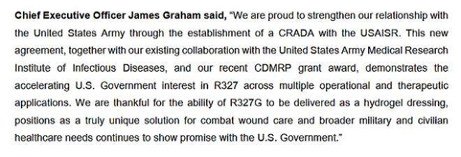 Recce CEO James Graham表示,这项新协议,连同与美国陆军传染病医学研究所(CRADA)的现有合作,以及最近获得的国防医疗研究与开发计划(CDMRP)拨款,均表明美国政府对R327在战伤护理方面的治疗效用愈发关注。