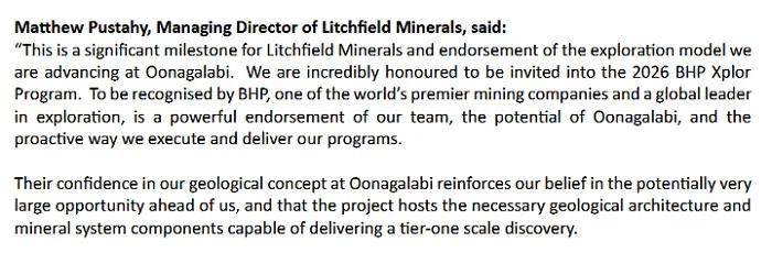 Litchfield还将获得BHP全球领先的技术专家与资源网络支持,其地质模型优化工作预计将得到实质性加速。