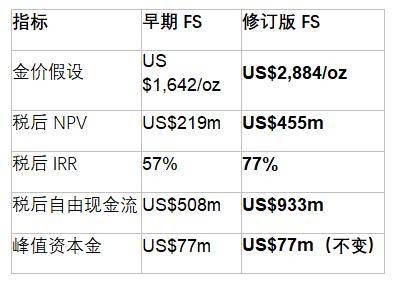 FS 模型采用实际币值(real terms)测算,未引入额外金价上行假设,反映的是项目自身的内生盈利能力。