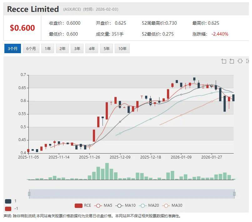 澳华财经在线数据库显示,RCE最新价0.615澳元,已发行股本2.89亿股,市值1.78亿澳元。