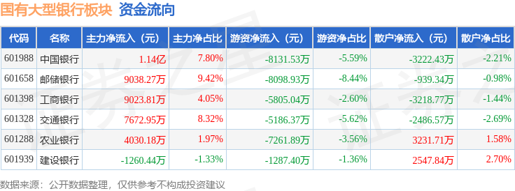 从资金流向上来看,当日国有大型银行板块主力资金净流入3.99亿元,游资资金净流出3.58亿元,散户资金净流出4087.58万元。国有大型银行板块个股资金流向见下表: