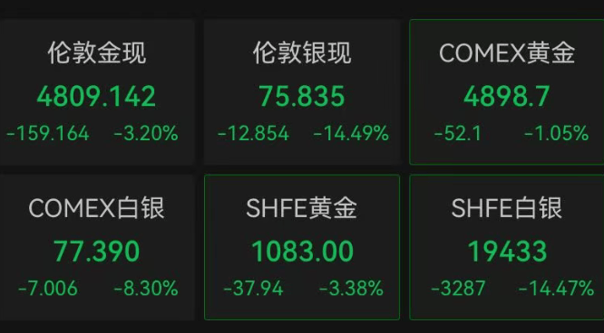 2月5日,黄金、白银价格大跳水。截至发稿,现货黄金日内跌超3%,现报4809美元/盎司;现货白银日内跌超14%,现报75.83美元/盎司。