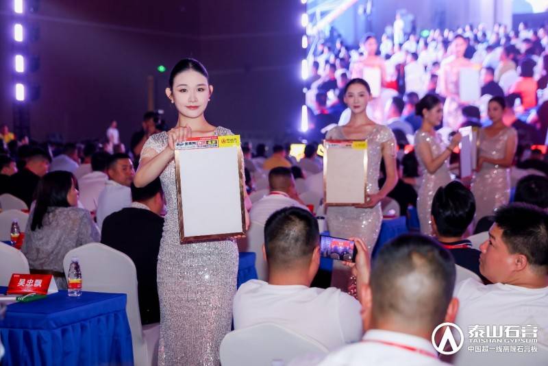 (发布会现场,模特向与会嘉宾近距离展示泰山石膏的金系列新品)