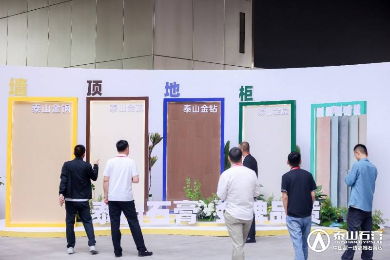 (参会嘉宾们在新品展示区现场了解泰山石膏最新发布的金系列产品)