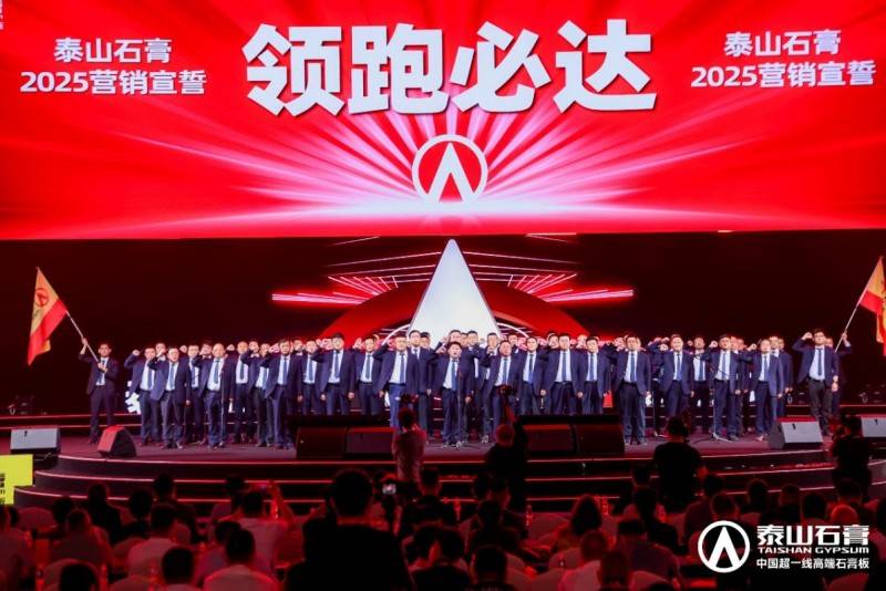 (泰山石膏营销将士现场进行2025营销宣誓,表达了全力以赴领跑必达的决心)