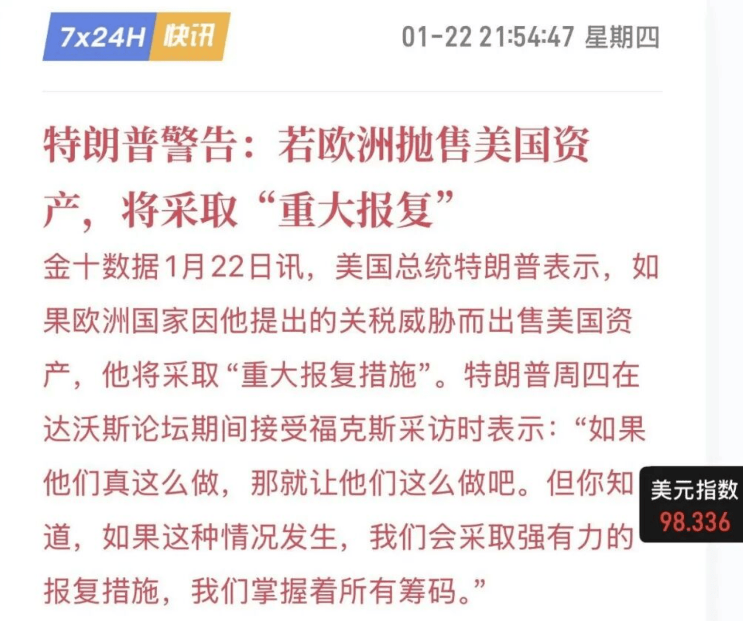 昨天特朗普再次表现出反复无常的强盗作风,周三达沃斯论坛美国总统特朗普刚刚表示取消对欧洲征关税并且不武力取得格陵兰岛后,昨天又变脸了。昨天特朗普表示,我们无需为收购格陵兰岛支付任何费用,任何协议都将允许美国对格陵兰岛实现“全面准入”;如果欧洲因关税威胁抛售美国资产,将面临重大报复。