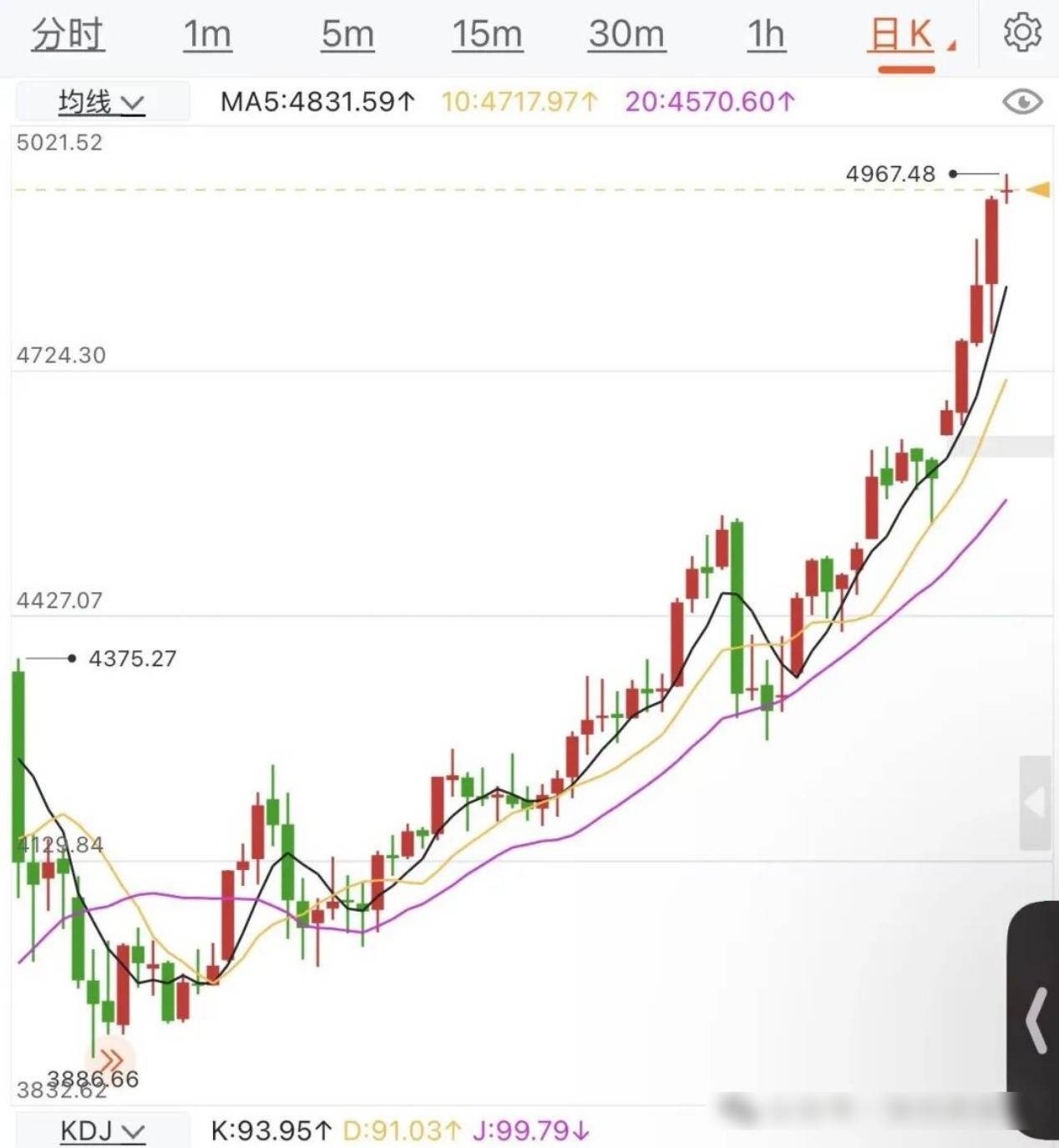 今天周五,黄金已经突破历史新高,多头强势。日内关键重点支撑4880-90(国内1100-97),一切回落不破这个区域,调整后都要涨;下破,就要注意风险了。随着价格的走高,洗盘还会加大力度,尤其是在冲击5000美元的时候;随随便便的波动一下就是100-200美元(国内23--45块)。