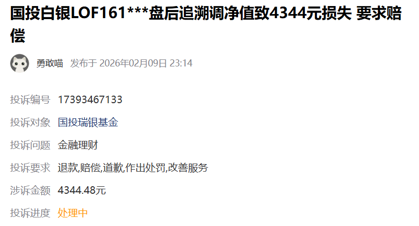 投资者因白银LOF 基金净值大跌遭受巨幅损失,纷纷发起维权。有投资者在“消费保”等第三方投诉平台发起投诉,数量迅速突破1.7万条。还有一些投资者通过社交媒体发声,质疑基金公司信息披露滞后、在交易结束后才公告调整,导致投资者在不知情下遭受超额损失。