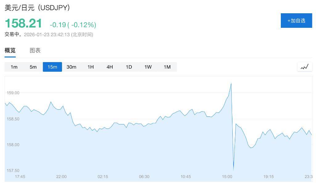 1月23日,日央行维持政策利率不变,但上调增长经济预期并释放出未来可能进一步加息的信号。然而,这一偏鹰派立场并未能阻止日元走软,美元兑日元一度逼近160的关键心理点位,随后汇率突然大幅上涨,引发了市场对官方干预的广泛猜测。财政大臣片山皋月对此未正面回应。
